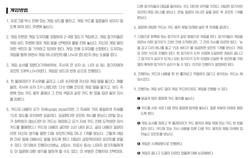 구성: 교사용 지침서, 게임 보드, 게임 말과 주사위(증정), 게임 포인트 100개, 박스