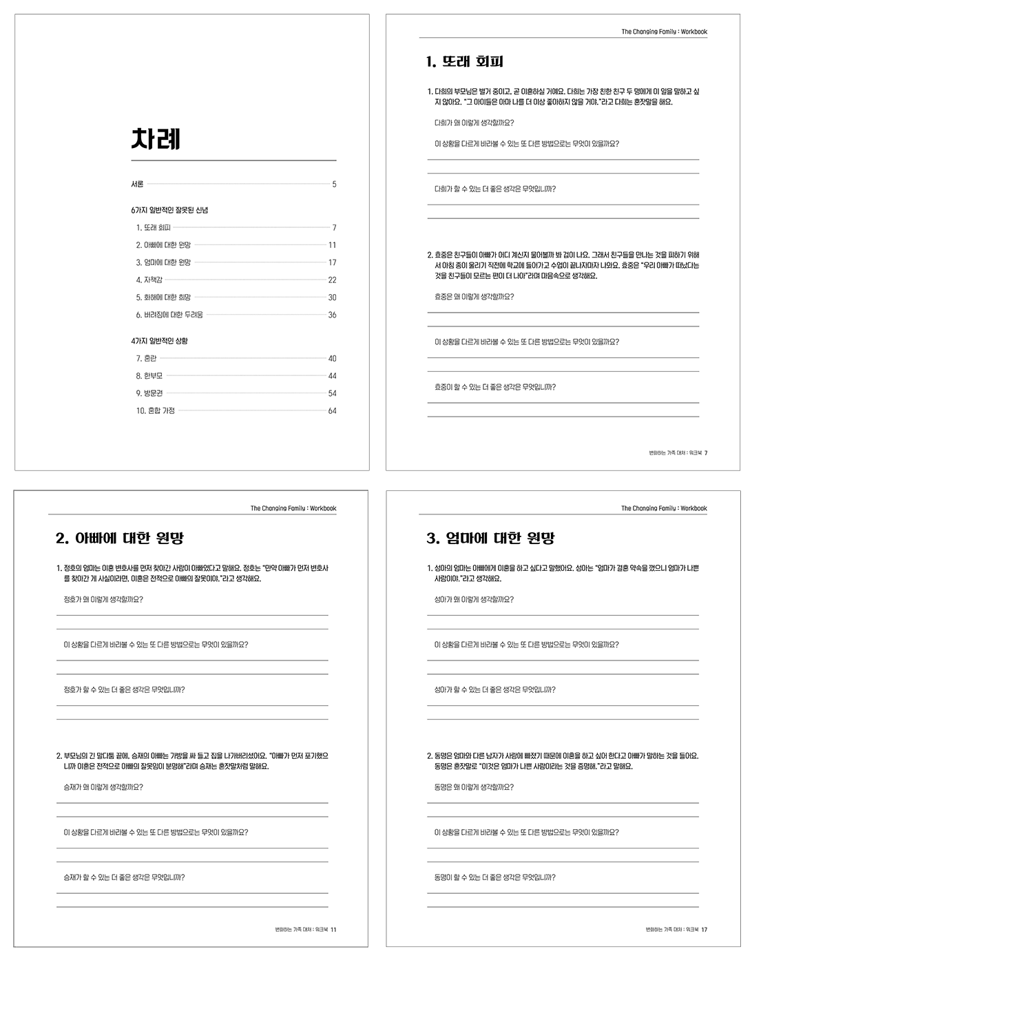 이 워크북은 여러분이 이혼으로 인해 그리고 이혼 후에 자주 일어나는 4개의 일반적인 상황들을 탐색하고 준비할 수 있도록 도와줄 것이다: 혼란, 한 부모, 방문권, 혼합가정