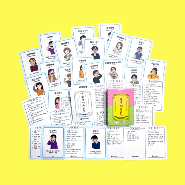 구성: 지침서, 감정대처카드 52개(앞면-감정단어, 감정 그림, 감정 단어 설명, 뒷면-대처방법(할 수 있는 일)), 작은 박스에 담겨져 있음