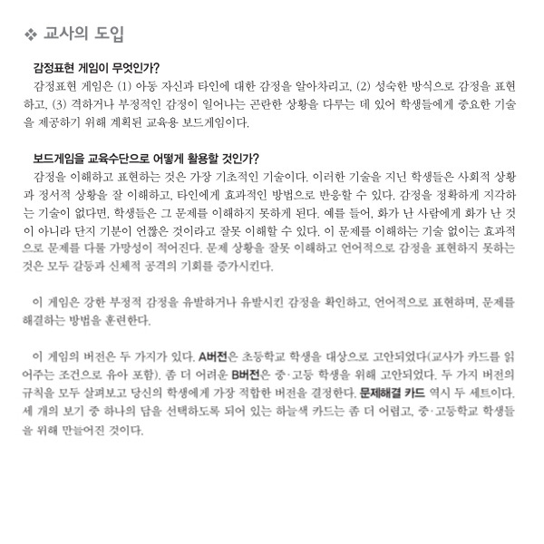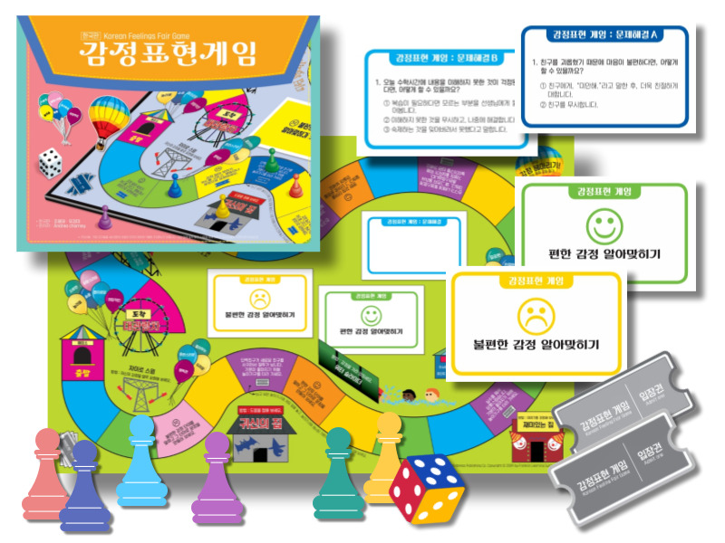 구성:지침서, 게임판, 감정카드 2종, 문제해결카드 2종, 말, 주사위, 입장권, 박스