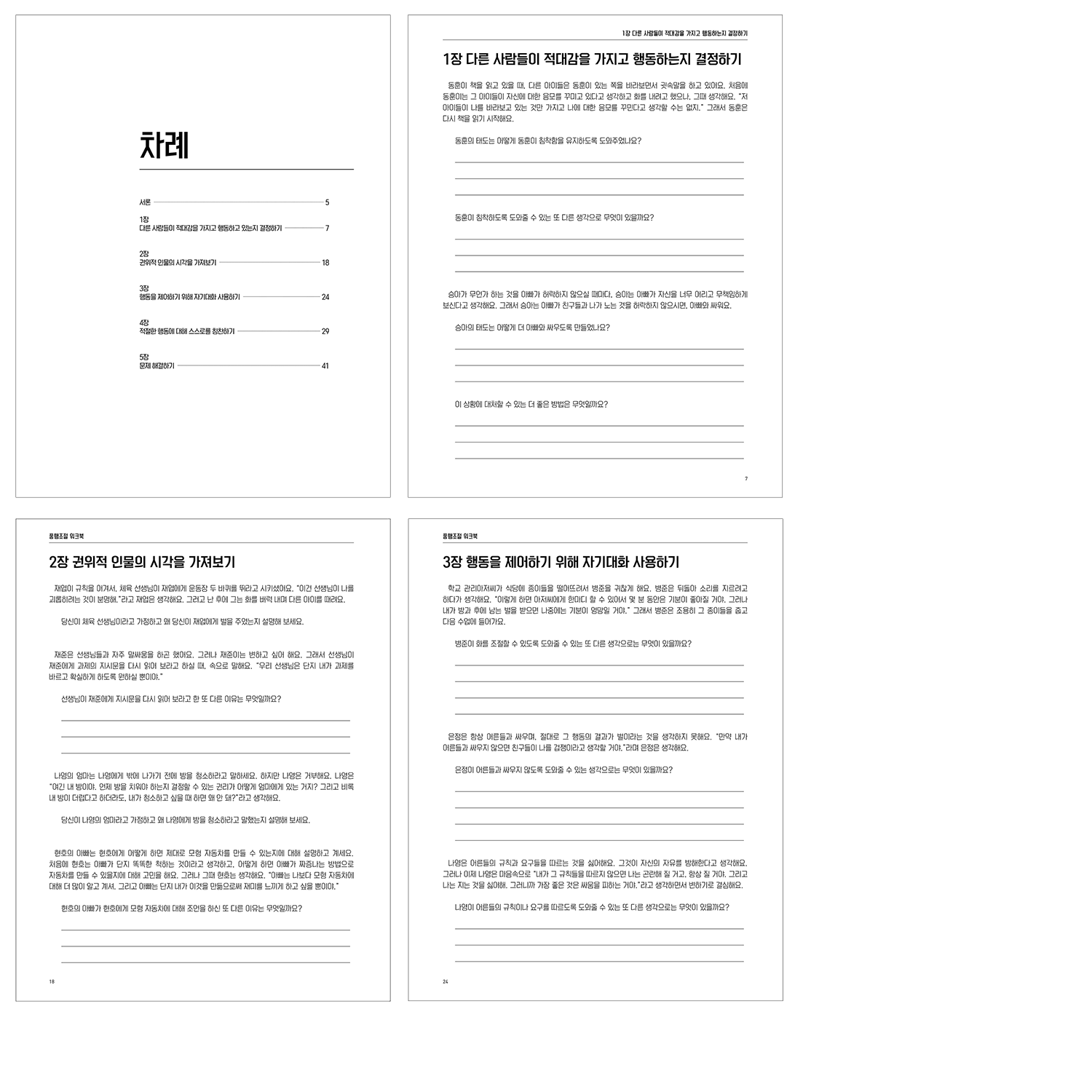 제 2장의 이야기들과 질문들은 갈등 상황에서 어른들의 시각을 가져보도록 연습할 수 있는 기회를 제공할 거예요.
