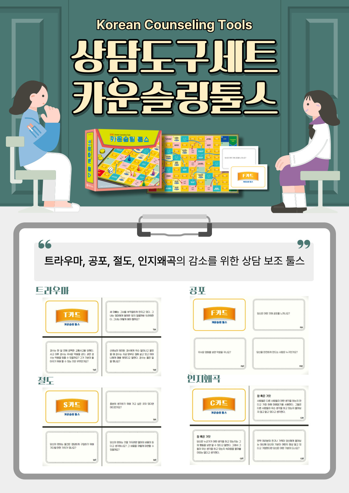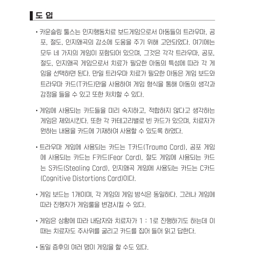 구성: 전문가 지침서, 게임 보드, 카드 4종(트라우마 카드, 절도 카드, 공포 카드, 인지왜곡(마음읽기, 비난, 과장확대, 필터링, 통제오류, 파국화 등) 카드, 각 빈카드도 5장 포함), 게임 포인트